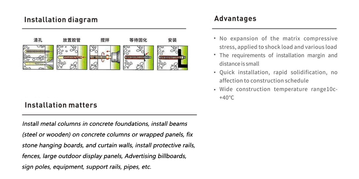 ظرفیت تحمل بار بالا-فناوری لنگر شیمیایی پیوند با قدرت بالا با بسترهایی مانند بتن و سنگ را تضمین می کند و مقاومت کششی/برشی آن به مراتب از لنگرگاه های مکانیکی فراتر می رود.